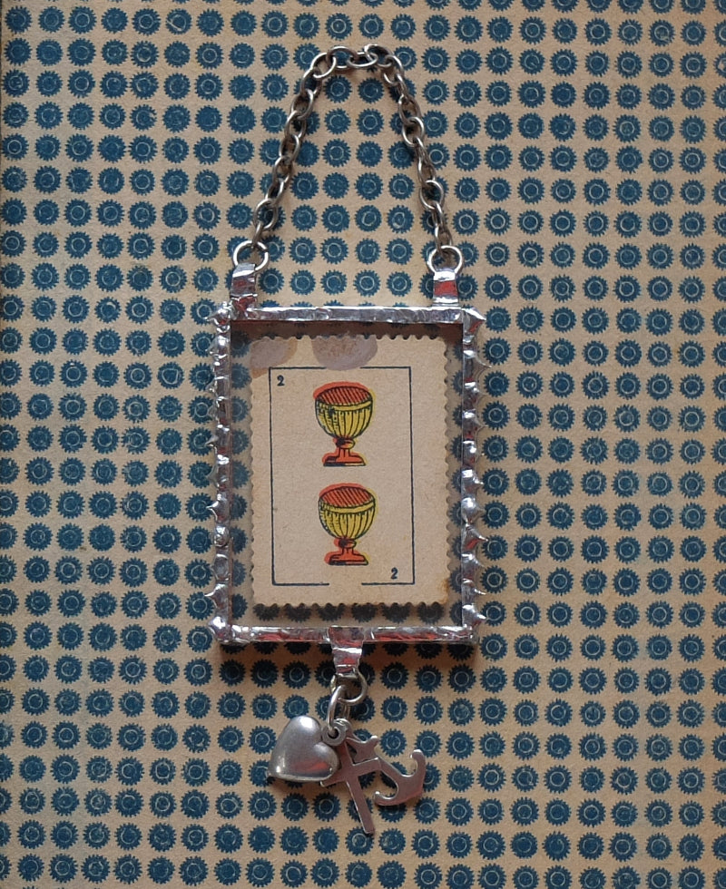 Materials: Card from a vintage Spanish deck framed with lead-free silver alloy and vintage silver charm: the heart for love, the cross for faith and the anchor for hope.