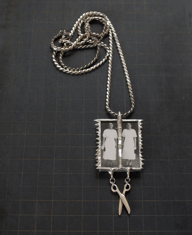 Materials: Vintage black & white framed photography with lead-free silver alloy and vintage silver charm.